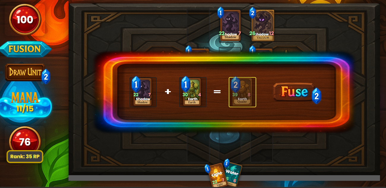 A card game where you fuse six basic elements into stronger units. There are 43 units in total (including 5 legendaries) that battle in the arena. The original plan was an auto-battler in the spirit of Teamfight Tactics, but with ~12 hours on the clock I stuck to a card version ;D